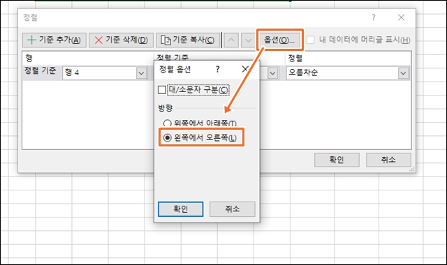 1. 정렬 옵션의 방향을 그림과 같이 '왼쪽에서 오른쪽'을 체크하면 해결이 됩니다. ▼