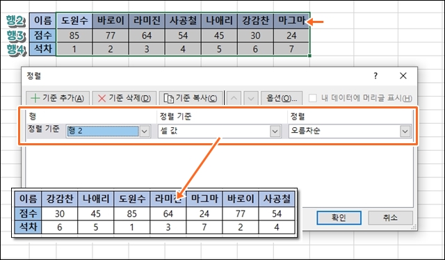 2. 이렇게 방향 설정을 해두면 아래그림에서 '석차순'으로 정렬된 표를 '이름순'으로 정렬하기 위해 표를 세로형으로 바꾸지 않아도 바로 정렬이 가능합니다. ▼