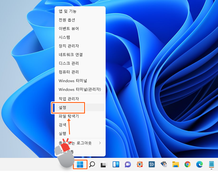 1. 화면 하단 중앙 시작버튼 - 마우스 오른메뉴 - 설정을 선택합니다. ▼
