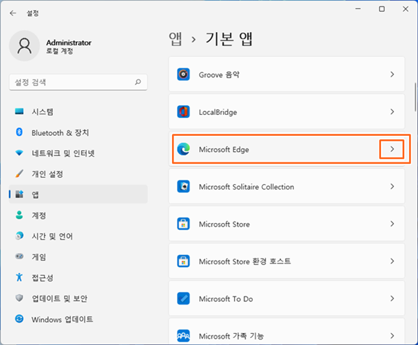 3. 마이크로소프트 엣지를 찾은 후 > 를 클릭 ▼
