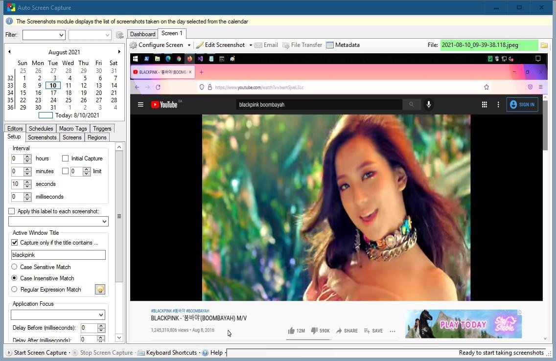 Download Auto Screen Capture for free. Automated screen capture utility. Auto Screen Capture takes screenshots while you work and play. Watch https://youtu.be/v6ajwNFIV_s to get started.