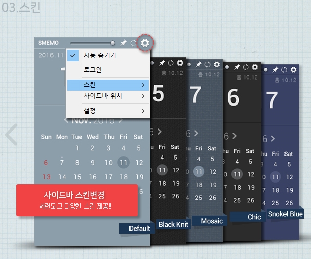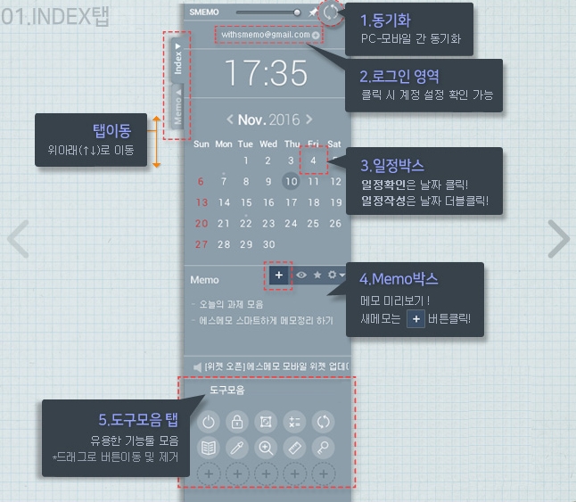 SMemo에는 메모 및 스케쥴관리 기능외에 다양한 수준의 맞춤형 서비스가 위젯과 도구모음 형태로 제공되는데 여기에는 화면캡쳐, 색상추출, 계산기, 비밀번호 관리, 날짜계산기, 바로가기 추가등이 있습니다.