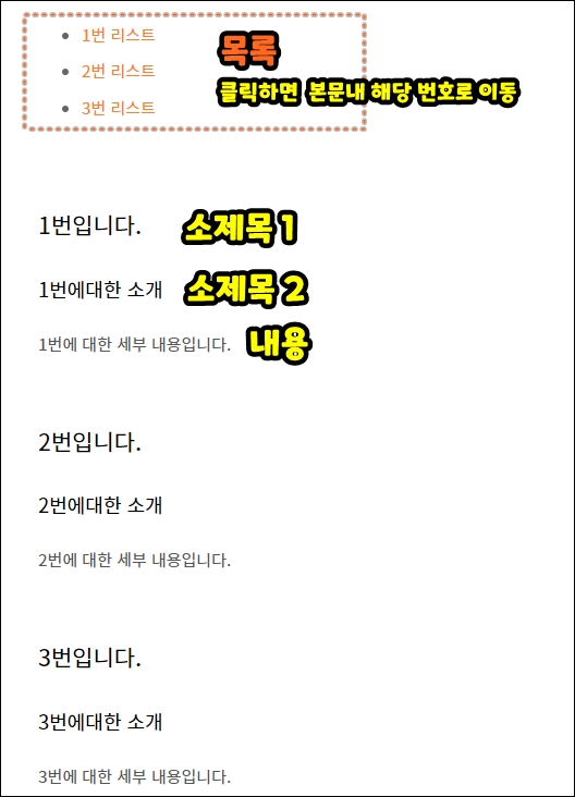 1. 해당 포스팅은 그림과 같이 상단에 목록이 있고, 목록 아래에 본문에는 목록과 일치하는 설명이 '제목2개와 내용'으로 구성되어 있습니다. 이때 목록에서 '2번 리스트'를 클릭하면 '2번에 대한 설명'이 있는 본문의 특정위치로 이동을 하게됩니다.