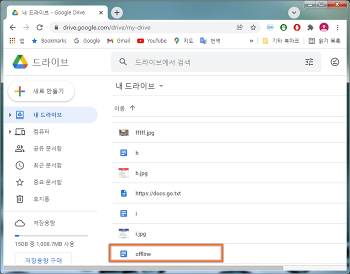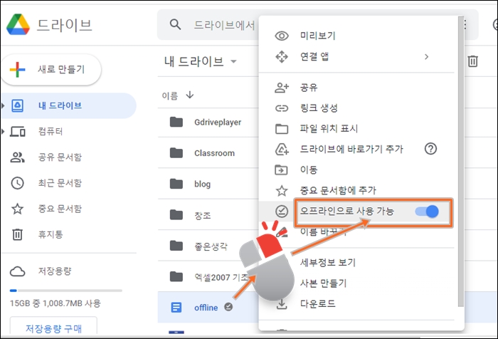 8. 마지막으로 구글드라이브에 이미 있는 문서를 오프라인에서 작업하려면, 오프라인으로 저장하려는 문서에서 마우스 오른메뉴 - 오프라인으로 사용 가능의 슬라이드를 on 하면 됩니다. ▼
