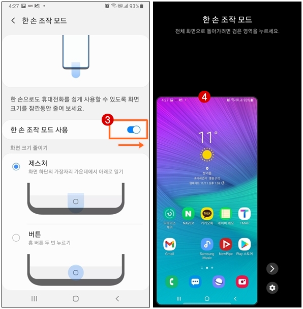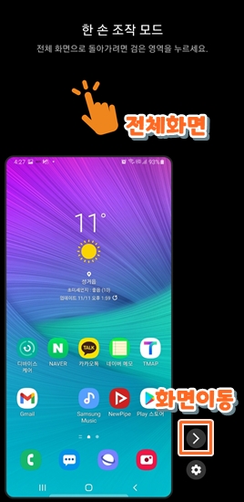 안드로이드폰에는 이런 불편함을 해소하기 위해 한 손으로 스마트폰을 제어하기 위한 아이디어를 고안했는데 그사용법은 다음과 같습니다.