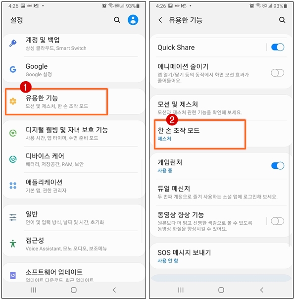 3. 한 손 조작모드 슬라이드 사용으로 ON ▼