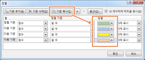 2. 1에서 설정한 기준을 '기준복사'를 이용하여 셀색상만큼 복사한후 색상을 지정하면 그림과 같이 점수에 할당이 된 셀색상별로 정렬이 됩니다. ▼