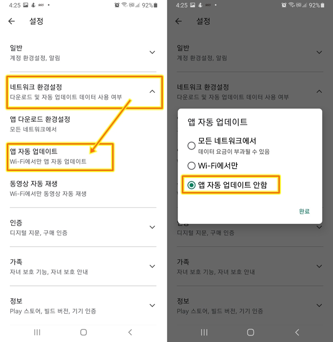 3. '설정 - 네트워크 환경설정 - 앱 자동 업데이트' 선택