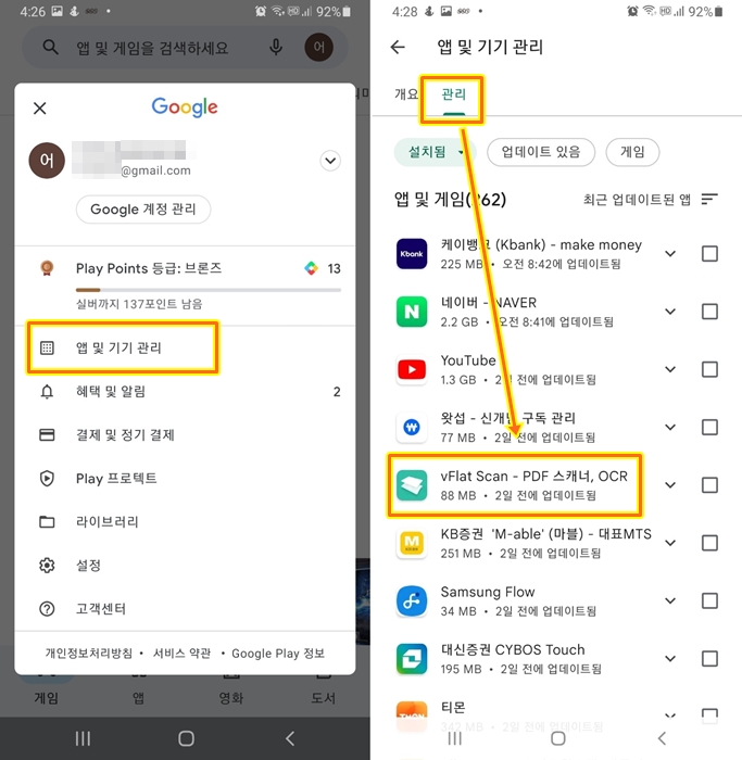 1. PLAY 스토어 첫 화면에서 우측 상단 '사용자 아이콘'을 선택한후 '앱 및 기기 관리' 선택