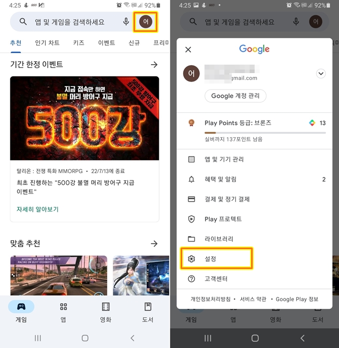 1. PLAY 스토어 첫 화면에서 우측 상단 '사용자 아이콘'을 선택