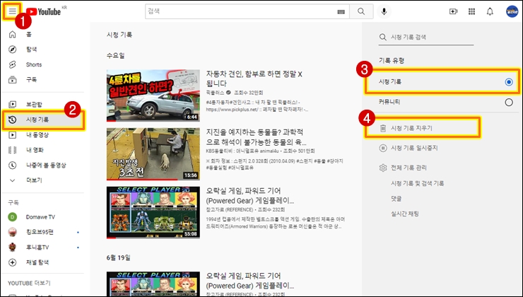 1-1. 웹브라우저에서 유튜브 방문 후 그림과 같이 시청기록 - 시청기록 지우기를 선택합니다. ▼