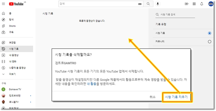1-2. 다음창에서 '시청 기록 지우기'를 클릭하면 그림과 같이 과거 시청기록이 모두 삭제됩니다. ▼