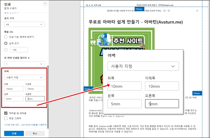 - 인쇄하기 전에 Microsoft Edge의 '인쇄 미리 보기' 기능을 사용하여 여백이 조정된 페이지에서 콘텐츠가 어떻게 표시되는지 확인하세요.