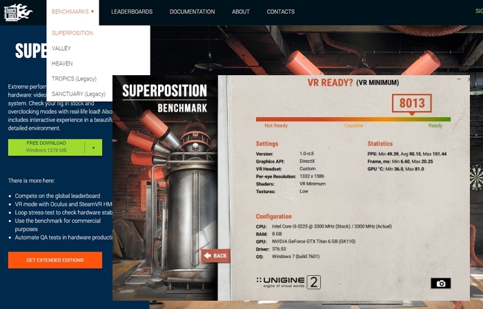 Unigine Suite는 다양한 시나리오에서 그래픽 카드의 기능을 테스트하는 고급 GPU 벤치마킹 도구 모음입니다. 이 벤치마크는 GPU의 성능을 평가하고 잠재적인 병목 현상을 식별하는 데 도움이 됩니다.