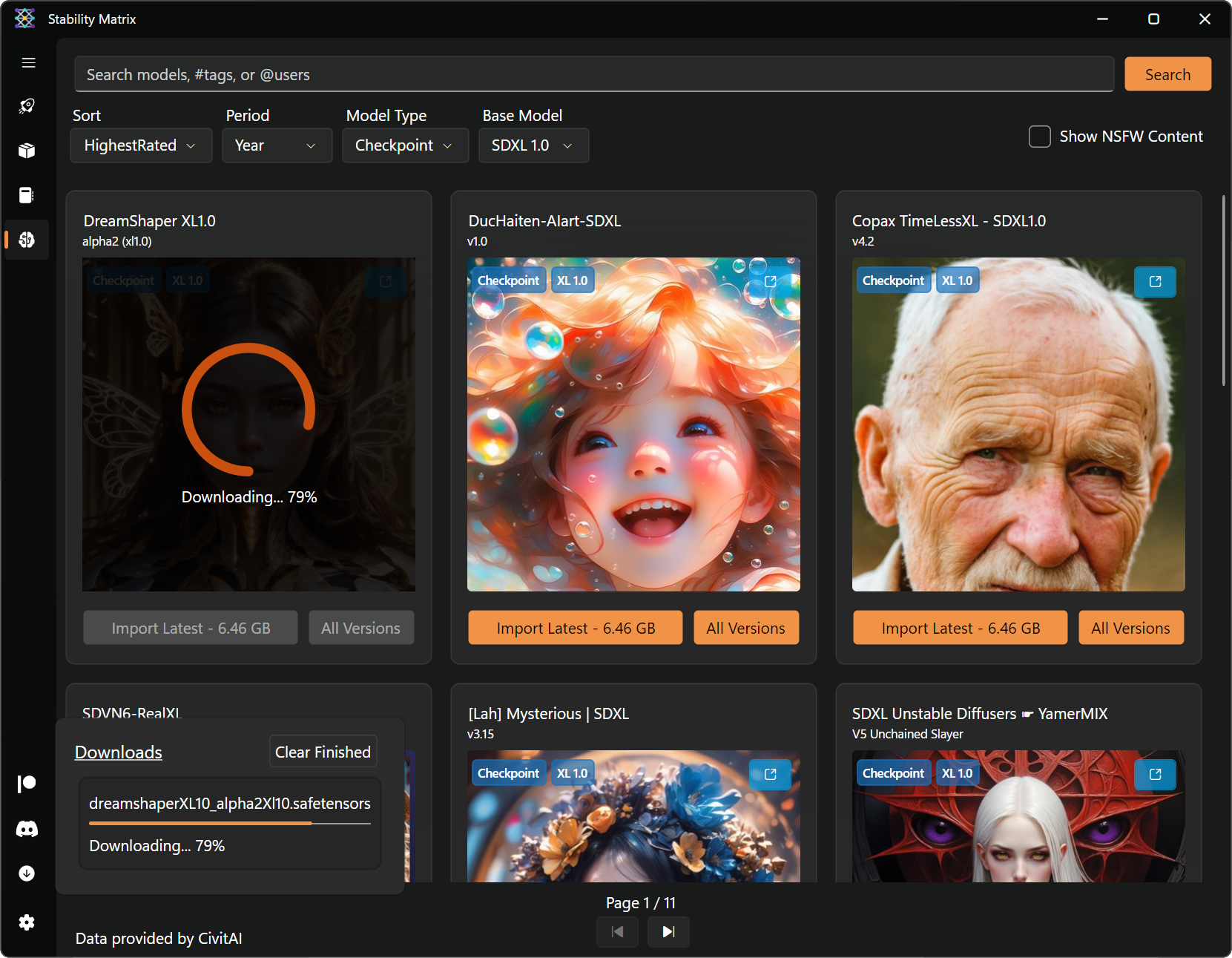 고급 모델 브라우저를 사용하면 CivitAI에서 직접 모델을 임포트할 수 있습니다. 모델을 임포트하면 메타데이터 파일과 미리보기 이미지가 포함된 적절한 공유 모델 디렉토리로 자동으로 이동합니다.