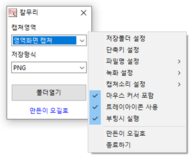 : 사용자는 원하는 캡처 범위와 저장할 포맷을 선택한 후 지정된 단축키(기본값은 PrintScreen)를 사용하여 캡처할 수 있습니다. 메뉴 접근은 칼무리 화면에서 오른쪽 마우스 클릭으로 가능합니다.