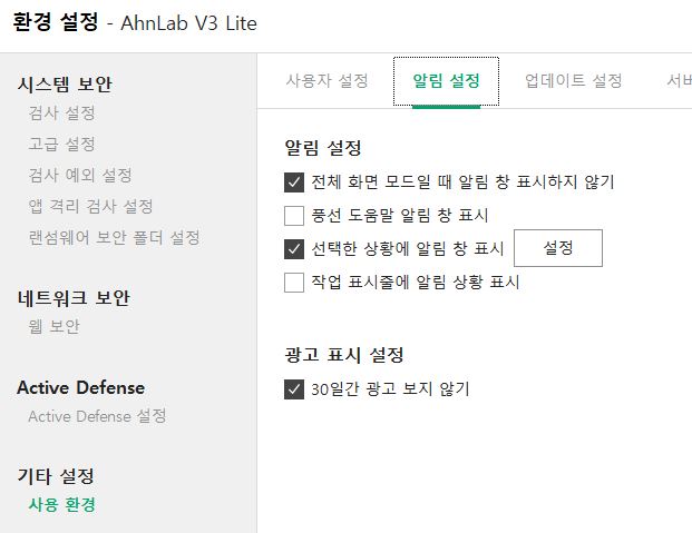 환경설정 - 기타설정 - 사용환경 - 알림 설정에서 '30일간 광보 보지 않기'에 체크하면 30일간 광고가 노출되지 않습니다. 30일마다 체크하면 됩니다.