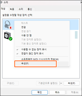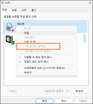 여러 오디오 출력 장치가 연결되어 있는 경우, 윈도우 설정에서 헤드폰을 기본 장치로 설정해야 합니다. 시스템 설정 > 소리 > 더 많은 소리 설정 > 재생 탭에서 헤드폰을 찾아 '기본 장치로 설정'을 선택하세요. ▼