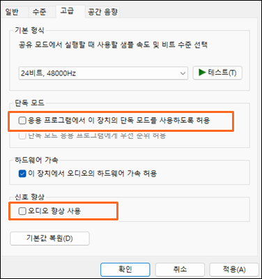 7. 독점 모드 및 오디오 개선 기능 비활성화