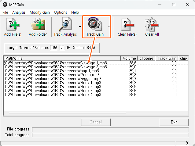 4. 볼륨 조정(Track Gain): 분석 결과를 바탕으로, '볼륨 조정' 기능을 사용하여 모든 파일의 볼륨을 원하는 레벨로 조정합니다. 사용자는 특정 데시벨 값을 설정하여 일관된 볼륨으로 조정할 수 있습니다. ▼