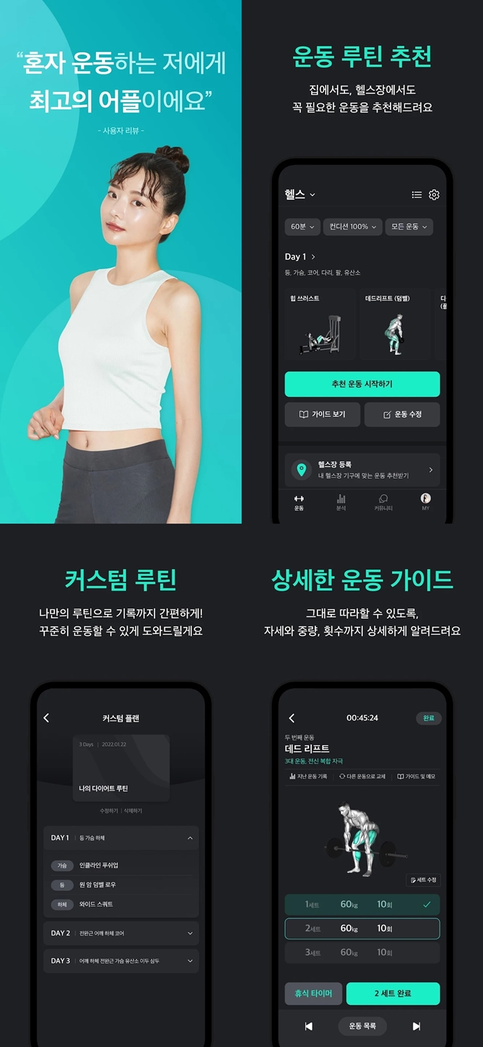 AI 헬스 트레이너로, 신체 고민을 해결하고 똑똑하게 운동할 수 있도록 도와줍니다. 사용자의 체중, 수준, 체성분을 고려하여 필요한 운동을 중량과 횟수까지 추천하며, 사용자가 다니는 헬스장의 기구를 활용하여 운동을 계획합니다. 또한 사용자는 나만의 커스텀 루틴을 만들어 기록하고, 다른 사람들과 소통하여 서로를 응원하고 자극받을 수 있습니다. 운동 영상과 가이드도 제공되어 초보자도 쉽게 따라할 수 있으며, 기록한 데이터는 AI 알고리즘에 반영되어 보다 정확한 운동 추천을 받을 수 있습니다.