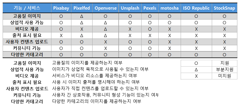 - 상업적 사용 가능: 제공되는 모든 컨텐츠는 상업적 용도로 사용할 수 있으며, 대부분의 경우 출처 표시 없이 사용할 수 있습니다.