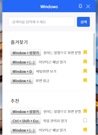 - 해당 단축키 오른쪽에 있는 즐겨찾기 노란 아이콘을 클릭하여 즐겨찾기에 추가합니다.