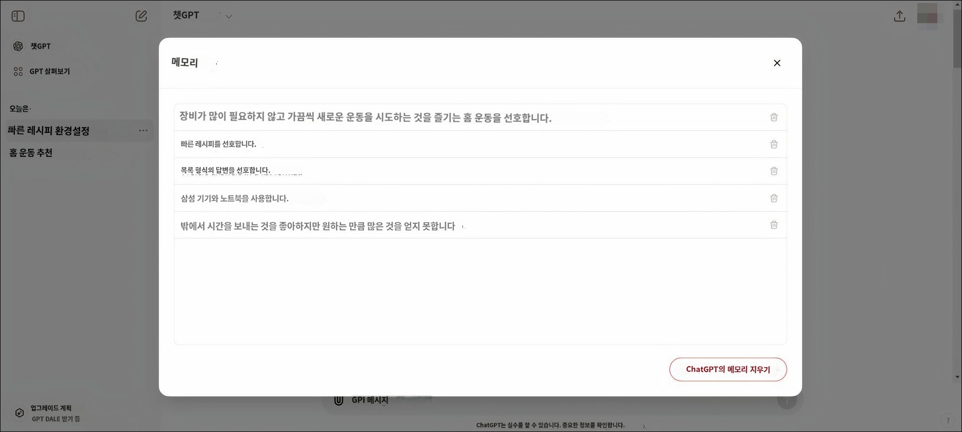 메모리 기능을 관리하는 것은 간단합니다. 취향이 바뀌었을 때는 "아침 운동 선호를 잊어줘"와 같은 명령어로 메모리를 삭제할 수 있습니다. 또한 설정에서 전체 메모리를 한꺼번에 삭제하거나, 특정 메모리만 삭제하는 것도 가능합니다. ▼