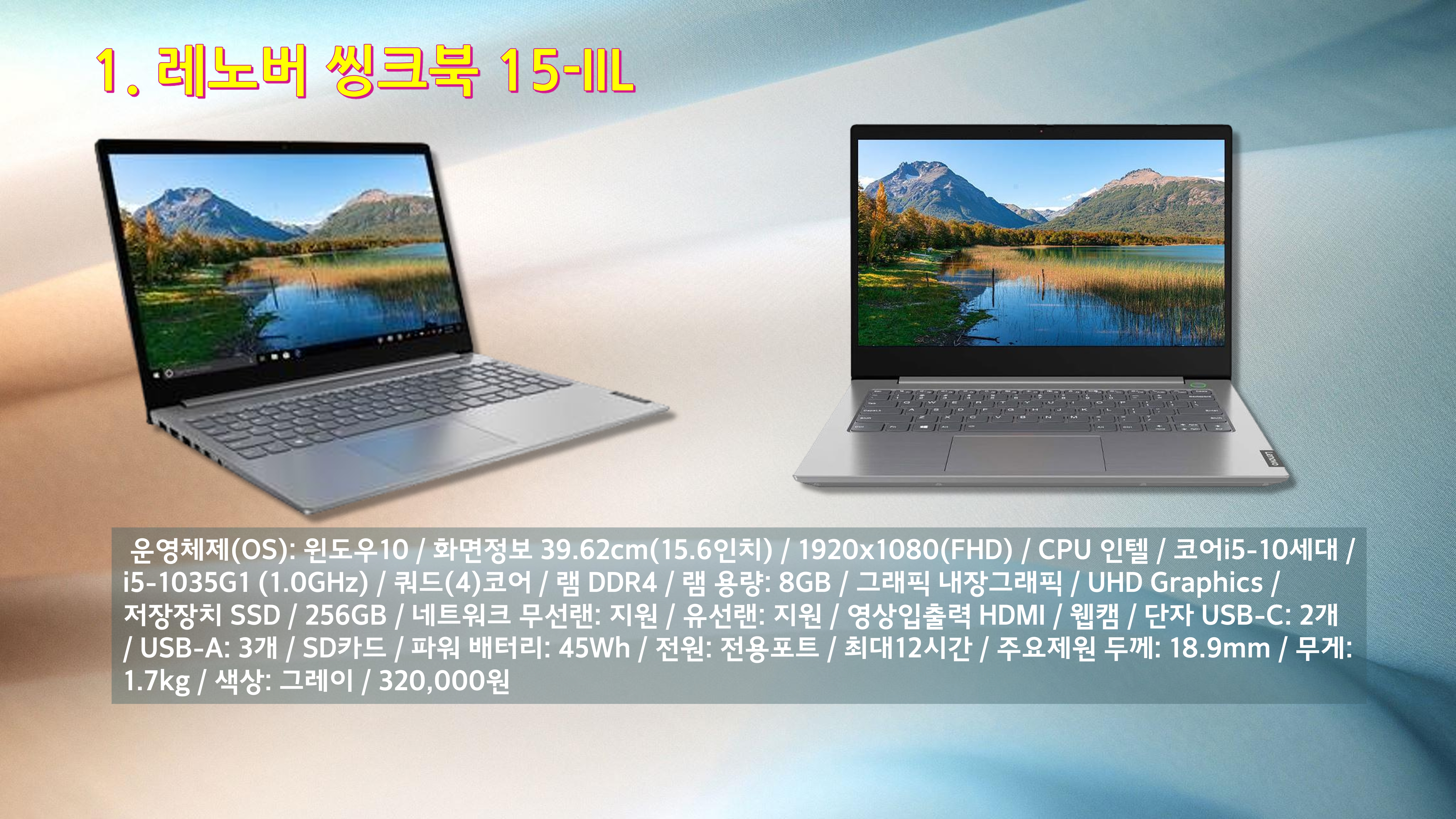 첫 번째로 추천할 모델은 레노버의 씽크북 15-IIL입니다. 이 노트북은 인텔 10세대 코어 i5 프로세서를 탑재해 가성비가 매우 우수한 제품입니다. 15.6인치의 FHD 해상도를 갖춘 디스플레이는 넉넉한 화면 크기와 선명한 화질을 제공하며, 오피스 작업이나 간단한 영상 시청에 적합합니다.