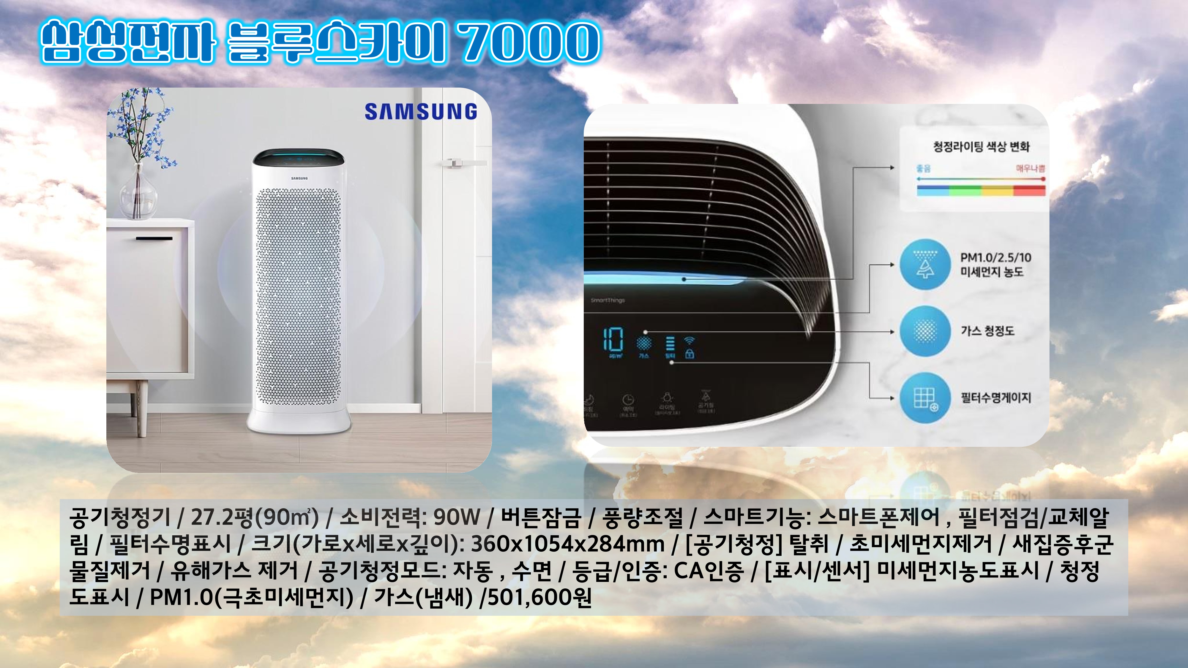 삼성 블루스카이 AX90T7020WBD는 스마트싱스 앱과 연동되어 외부에서도 실내 공기 상태를 쉽게 확인하고 공기청정기를 제어할 수 있습니다. 넓은 공간을 사용하거나 스마트한 생활을 원하는 분들에게 최적의 선택입니다. 강력한 성능과 스마트 기능을 동시에 원하는 소비자들에게 추천하는 제품입니다.