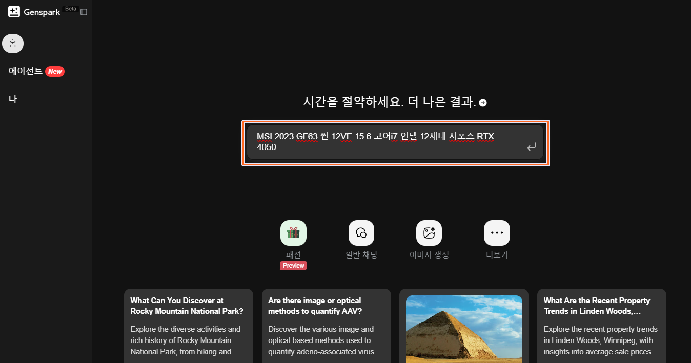 2. 젠스파이크(genspark) 에 제품명을 입력. 검색을 시작합니다.