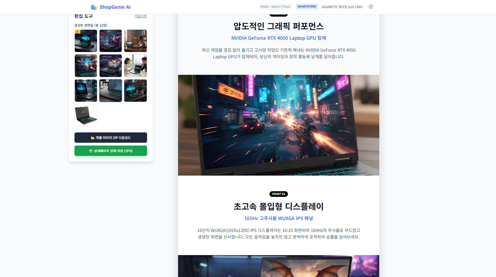 - STEP 4. 편집 및 저장: 완성된 페이지를 미리보기로 확인하세요. 텍스트가 마음에 안 들면 "조금 더 감성적으로 바꿔줘"라고 요청하고, 이미지가 아쉽다면 매직 에디터로 수정하면 됩니다. 완벽하다면 '전체 저장(JPG)' 또는 '이미지 개별 다운로드(ZIP)'를 눌러 쇼핑몰에 바로 업로드하면 끝! 정말 쉽고 빠르죠?